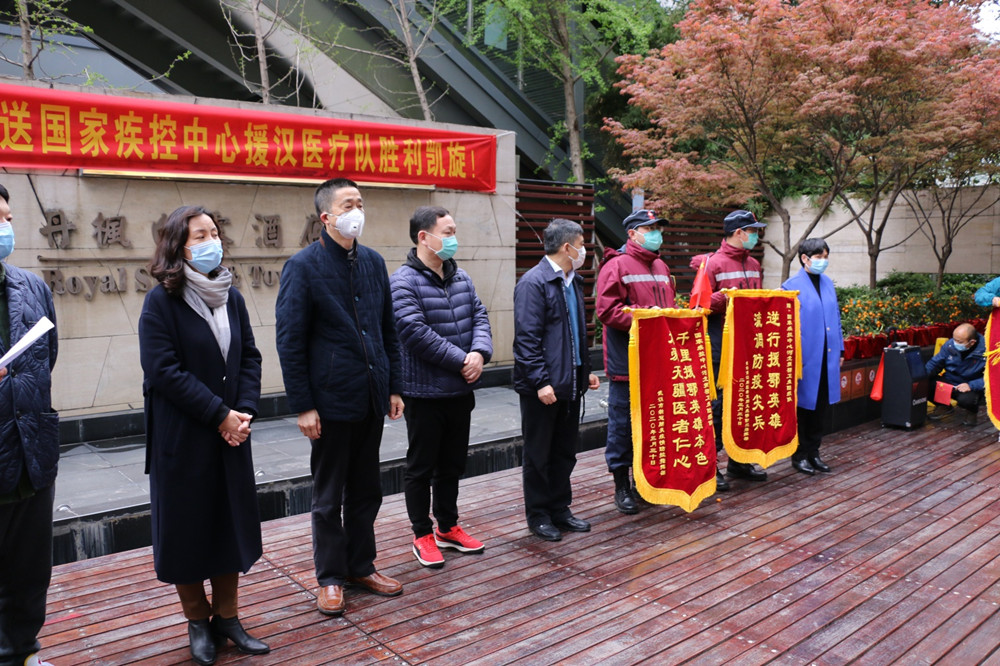 3月30日下午,湖北東信醫(yī)藥有限公司志愿者代表一行十三人應(yīng)邀參加了江岸區(qū)政府組織的河北省援漢醫(yī)療隊(duì)返程歡送儀式。江岸區(qū)有關(guān)部門的領(lǐng)導(dǎo)代表武漢人民感謝河北省第二批、第三批援漢醫(yī)療隊(duì)員的辛勤勞動(dòng)和無私付出,并向他們贈(zèng)送了錦旗和鮮花。