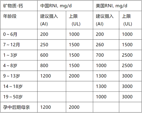 每日鈣的推薦攝入量* (RNI)