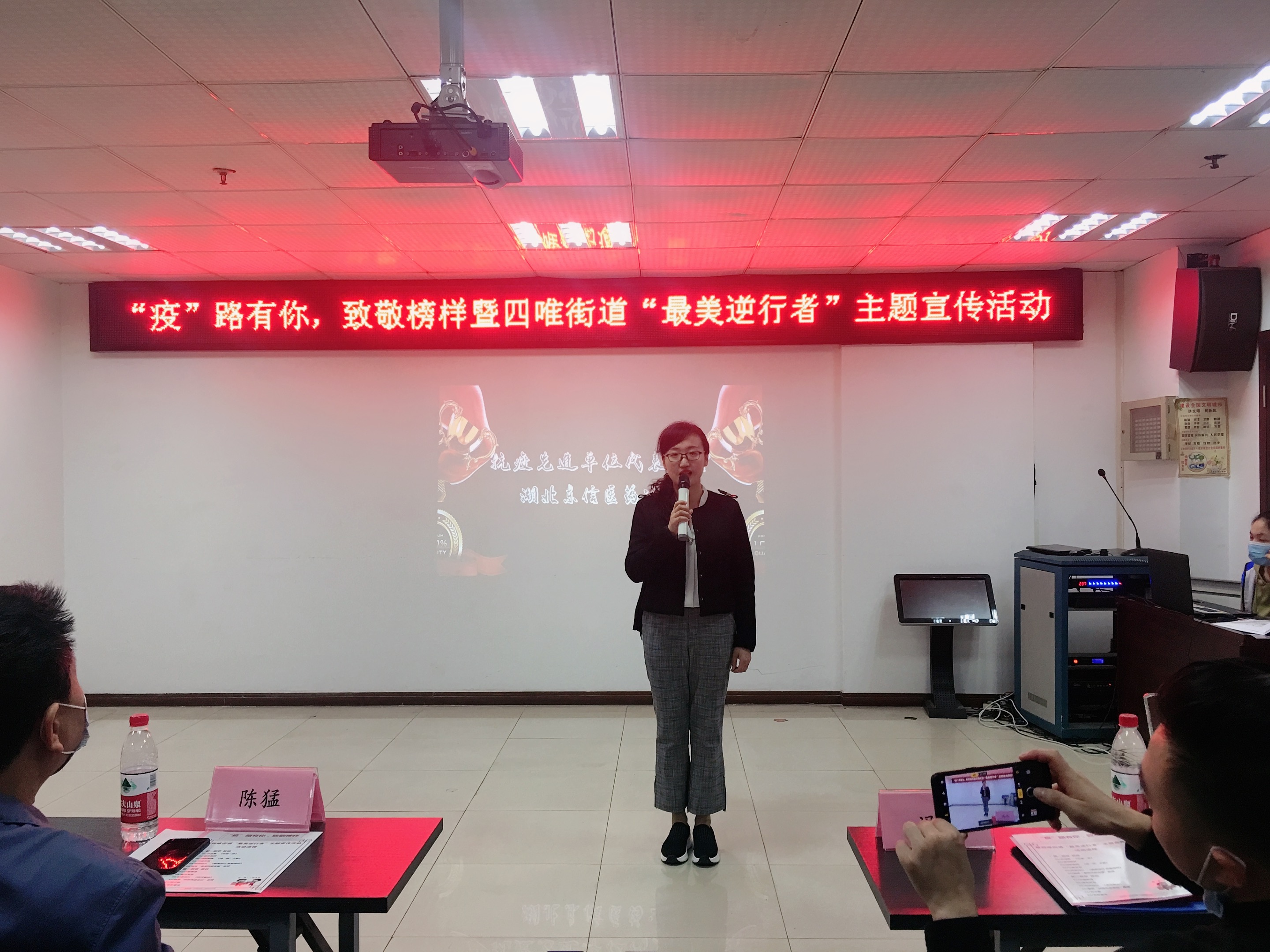 主題宣傳活動(dòng)期間,大家一起視頻學(xué)習(xí)了抗疫志愿者們不畏艱險(xiǎn)、逆行沖鋒的感人事跡,并邀請(qǐng)了抗疫先進(jìn)企業(yè)和志愿者代表上臺(tái)分享他們的抗疫故事。東信醫(yī)藥黨支部書(shū)記張琳作為企業(yè)代表,上臺(tái)講述了東信醫(yī)藥的抗疫事跡以及防汛精神,從疫情期間企業(yè)捐款捐藥,企業(yè)的黨員們帶頭走進(jìn)社區(qū)做志愿者,到防汛期間積極響應(yīng)號(hào)召,不辭勞苦,風(fēng)雨無(wú)阻,24小時(shí)堅(jiān)守在防汛巡查一線。東信醫(yī)藥的事跡讓大家深受感動(dòng),獲得了熱烈的掌聲。