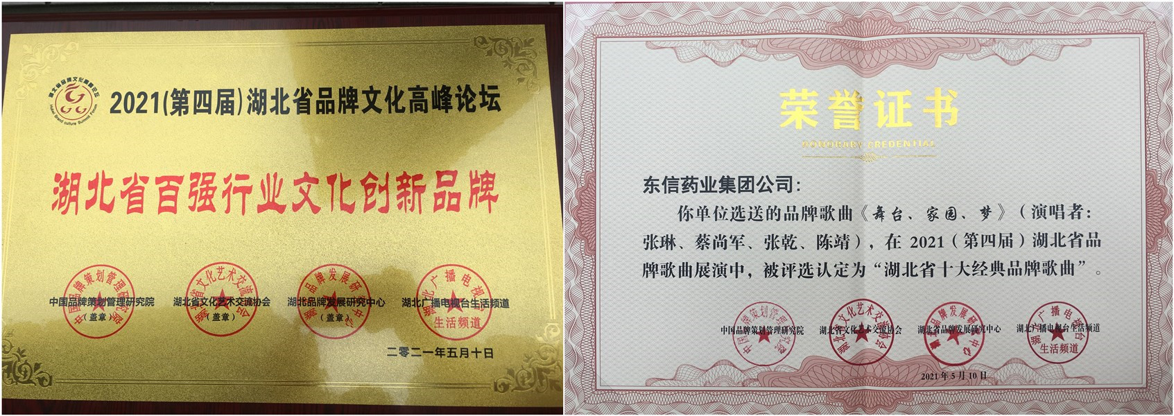 2021年5月10日,2021(第四屆)湖北省品牌文化高峰論壇在武漢空中花果山影視城隆重舉行。在論壇和“品牌歌曲、品牌故事展演會(huì)”的頒獎(jiǎng)環(huán)節(jié),東信醫(yī)藥集團(tuán)“雙喜臨門”,分別摘得“湖北省百?gòu)?qiáng)行業(yè)文化創(chuàng)新品牌”和“2021(第四屆)湖北省十大經(jīng)典品牌歌曲”兩項(xiàng)殊榮。