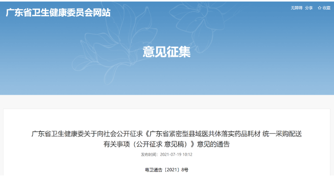 為提高縣域醫(yī)療衛(wèi)生資源配置和使用效率,7月19日,廣東省衛(wèi)健委官網(wǎng)發(fā)布《廣東省緊密型縣域醫(yī)共體落實藥品耗材統(tǒng)一采購配送有關事項(公開征求意見稿)》(以下簡稱《意見稿》),對其公開征求意見。這份僅有800余字的意見稿,字雖少但信息量大。