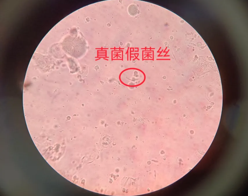 另外,在另一個(gè)視野中看到了真菌的假菌絲,見下圖紅色圓圈,說明真菌生長(zhǎng)繁殖有些旺盛,且患者感染真菌時(shí)間較長(zhǎng);滴蟲為近期感染所致。然而,從pH值角度來看,滴蟲和真菌的pH值互相沖突。醫(yī)生認(rèn)為,該患者可能是早些時(shí)候已經(jīng)感染了真菌,真菌經(jīng)過一段時(shí)間的生長(zhǎng)繁殖,長(zhǎng)出了假菌絲,近期感染了滴蟲,滴蟲阻礙了乳酸桿菌的酵解,使乳酸生成減少,進(jìn)而使陰道PH值轉(zhuǎn)變?yōu)橹行曰驂A性,而真菌又不怕中性或堿性環(huán)境,故而出現(xiàn)滴蟲合并真菌感染的情況。