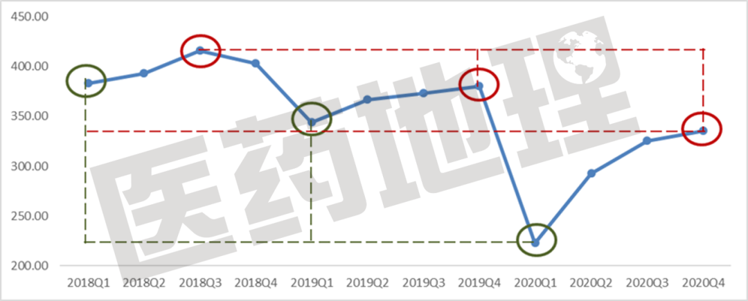 2020年共實現(xiàn)銷售額1176億元,相較于2019年大幅回落近20%。具體來看,2020年1季度創(chuàng)下了2013年以來的低點,雖然從Q2開始一路爬升,但直到Q4也未達到前兩年的單季度最低值。自2013年起,中藥市場規(guī)模不斷擴大,至2017年達到峰值,在2018年平穩(wěn)過渡后,2019年出現(xiàn)小幅下降,歷經(jīng)2020年疫情最低點后,預(yù)計2021年將會緩慢回升,但短期內(nèi)無法達到另一個高點。