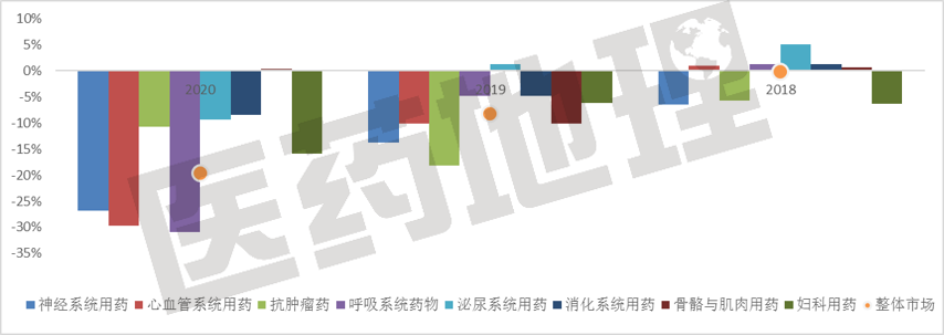 2020年,統(tǒng)計當前的TOP8治療領(lǐng)域增長情況后發(fā)現(xiàn)(以中藥主治疾病的治療大類計),受整體市場影響,僅有骨骼肌肉用藥出現(xiàn)了極微弱的增長,而其他領(lǐng)域都是負增長,但程度有所不同,有4個領(lǐng)域的降幅在市場均值以上(抗腫瘤、泌尿、消化、婦科),僅有2個領(lǐng)域在近三年的增速均高于市場均值(泌尿、消化)。而神經(jīng)系統(tǒng)用藥作為市場份額第一的治療類別,近三年的增速均低于市場均值。