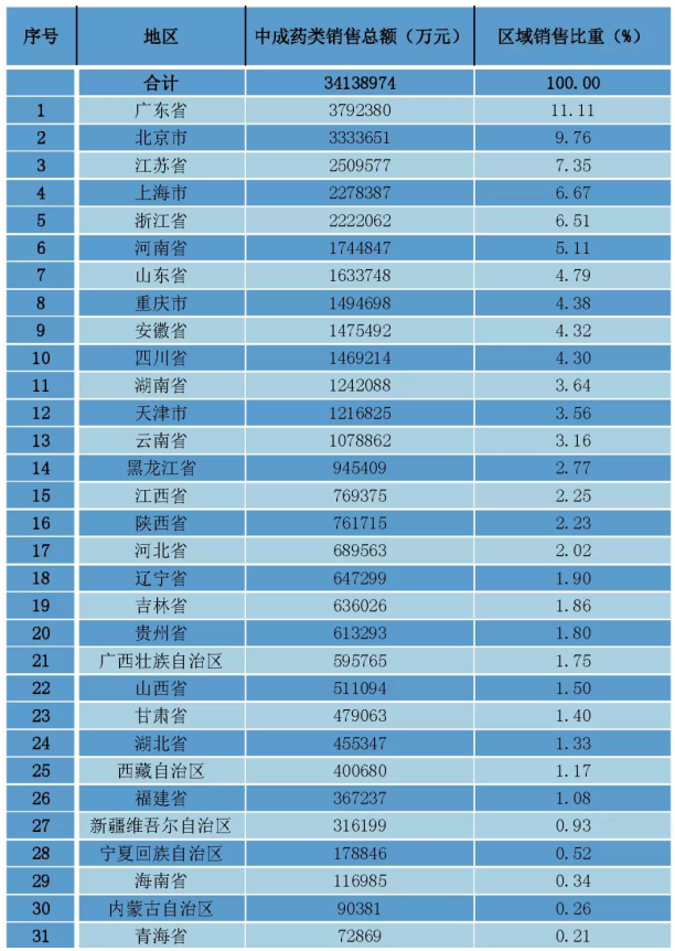 2020年中國各省區(qū)中成藥銷量分布及所占比重
