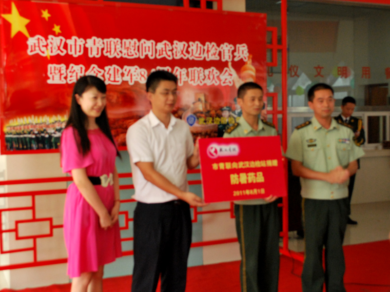 2011年8月1日,團(tuán)市委書記、武漢市青年聯(lián)合會(huì)主席沈濤及武漢市青年聯(lián)合會(huì)副秘書長(zhǎng)、東信醫(yī)藥集團(tuán)董事長(zhǎng)田南希代表武漢市青年聯(lián)合會(huì)向武漢邊檢官兵捐贈(zèng)防暑飲品。在紀(jì)念人民解放軍建軍84周年之際,表達(dá)了武漢市青年聯(lián)合會(huì)對(duì)邊檢官兵的崇敬之情,及東信醫(yī)藥集團(tuán)對(duì)邊檢官兵工作的關(guān)心與支持。