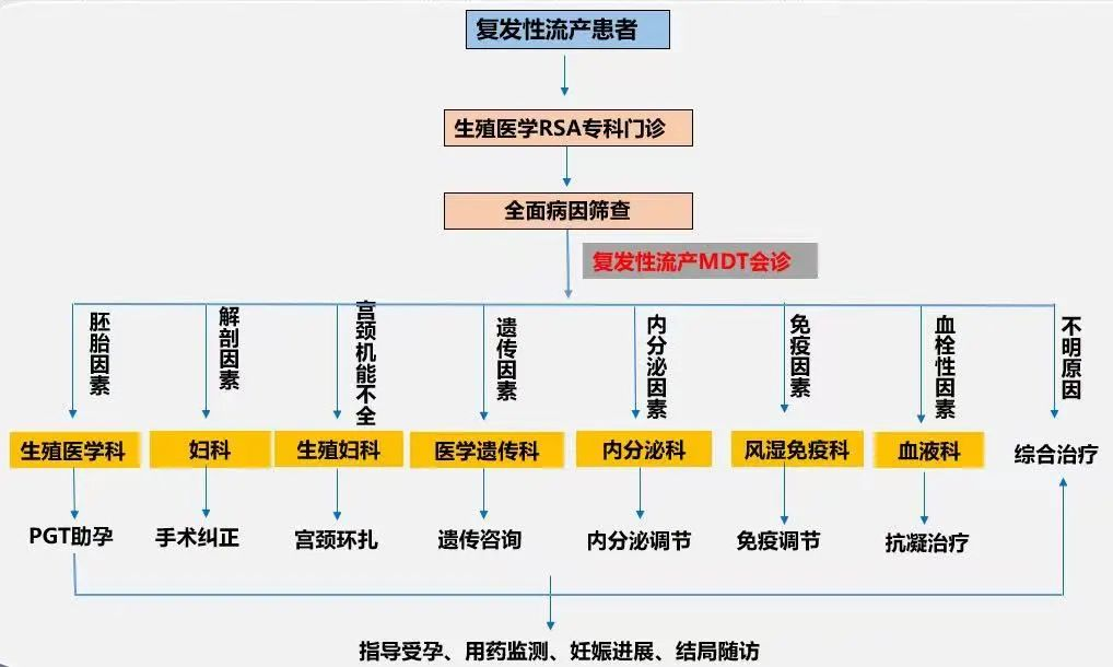 復(fù)發(fā)性流產(chǎn)病因復(fù)雜,涉及多學(xué)科且缺乏特異性臨床表現(xiàn),需要孕前、孕期甚至孕后的全程管理,所以聯(lián)合以上多個科室專家診療才能獲得全面、系統(tǒng)、高效的診療效果。多學(xué)科聯(lián)合會診(Multidisciplinary Team,MDT)的目的正是將各學(xué)科專家集合在一起,針對患者情況進(jìn)行集中討論,制定出一個完善、全面的治療方案。