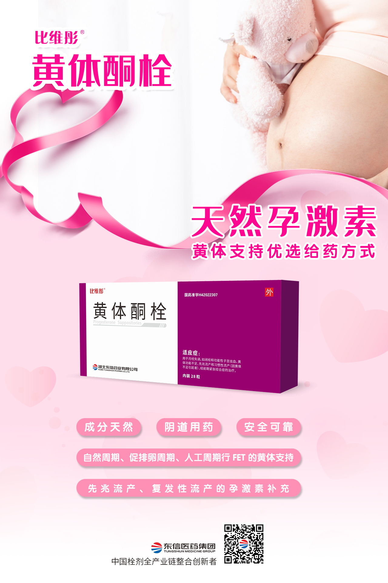 比維彤®黃體酮栓是由黃姜中提取的天然黃體酮,與人體內(nèi)源性黃體酮化學(xué)結(jié)構(gòu)相同,水溶性基質(zhì)栓劑,吸收率高,副反應(yīng)低,臨床使用更安全。