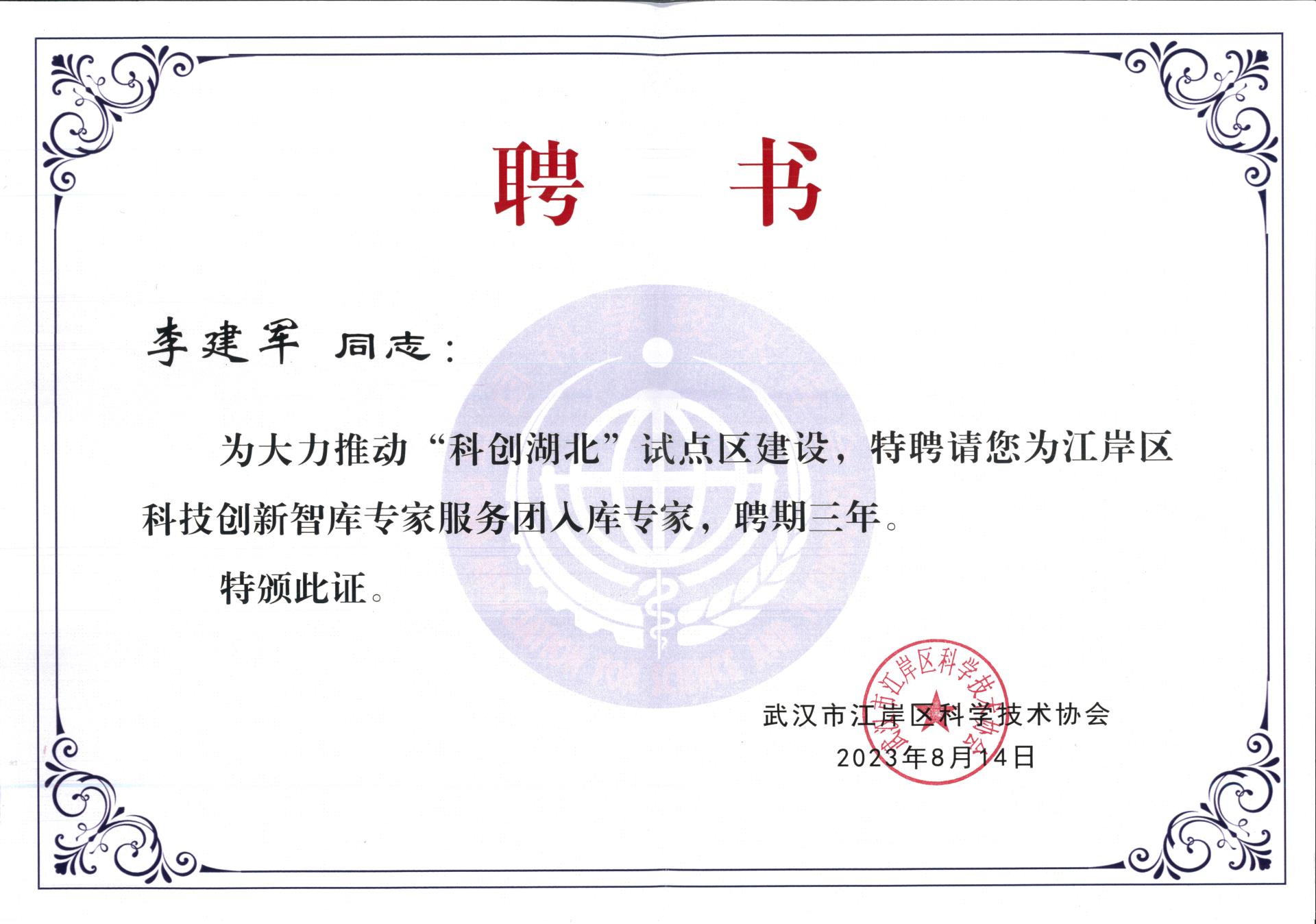 10月31日,由湖北省科學(xué)技術(shù)協(xié)會(huì)主辦,江岸區(qū)人民政府等單位協(xié)辦的2023“科創(chuàng)湖北”學(xué)會(huì)專(zhuān)家荊楚行(武漢·江岸站)活動(dòng)在武漢市江岸區(qū)舉行,湖北省、武漢市科學(xué)技術(shù)協(xié)會(huì)領(lǐng)導(dǎo),湖北省學(xué)會(huì)、高校專(zhuān)家,江岸區(qū)領(lǐng)導(dǎo)等出席了會(huì)議。湖北東信醫(yī)藥有限公司總經(jīng)理李建軍被武漢市江岸區(qū)科學(xué)技術(shù)協(xié)會(huì)聘為科技創(chuàng)新智庫(kù)專(zhuān)家服務(wù)團(tuán)入庫(kù)專(zhuān)家并應(yīng)邀出席會(huì)議。