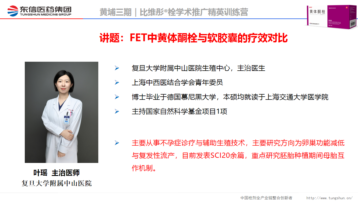 在專家授課環(huán)節(jié),復(fù)旦大學(xué)附屬中山醫(yī)院生殖科葉瑤醫(yī)師帶來了《FET中黃體酮栓與軟膠囊臨床對比》,葉老師介紹了黃體酮栓劑較肌注使用更為方便,不會有疼痛感,大大避免了痛苦的副作用和不良反應(yīng),同時不會產(chǎn)生口服黃體酮制劑生物利用度低、容易產(chǎn)生頭暈的弊端。隨后葉老師通過回顧性分析比較了黃體酮栓劑與軟膠囊在凍融胚胎移植的療效,黃體酮栓劑有著更高的妊娠率以及更低的早期流產(chǎn)率。