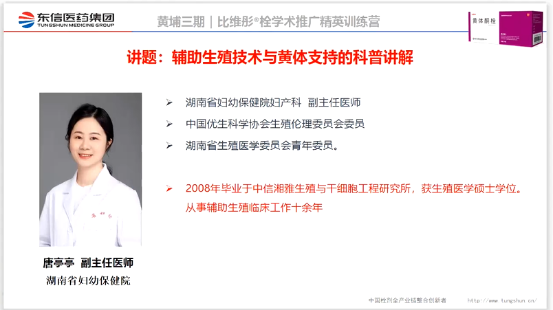 湖南省婦幼保健院生殖醫(yī)學(xué)中心的唐亭亭老師為大家?guī)砹恕遁o助生殖技術(shù)與黃體支持的科普講解》,唐老師先給大家介紹了什么是不孕癥和輔助生殖技術(shù),也介紹了輔助生殖技術(shù)中黃體支持的必要性。最后唐老師講解了黃體支持的常用藥物,其中黃體酮栓因采用水溶性基質(zhì)—硬脂酸聚烴氧酯,具有快速溶解、增加藥物分解、提高生物利用度和藥效的作用。并且還可直腸給藥,藥效并不會降低。