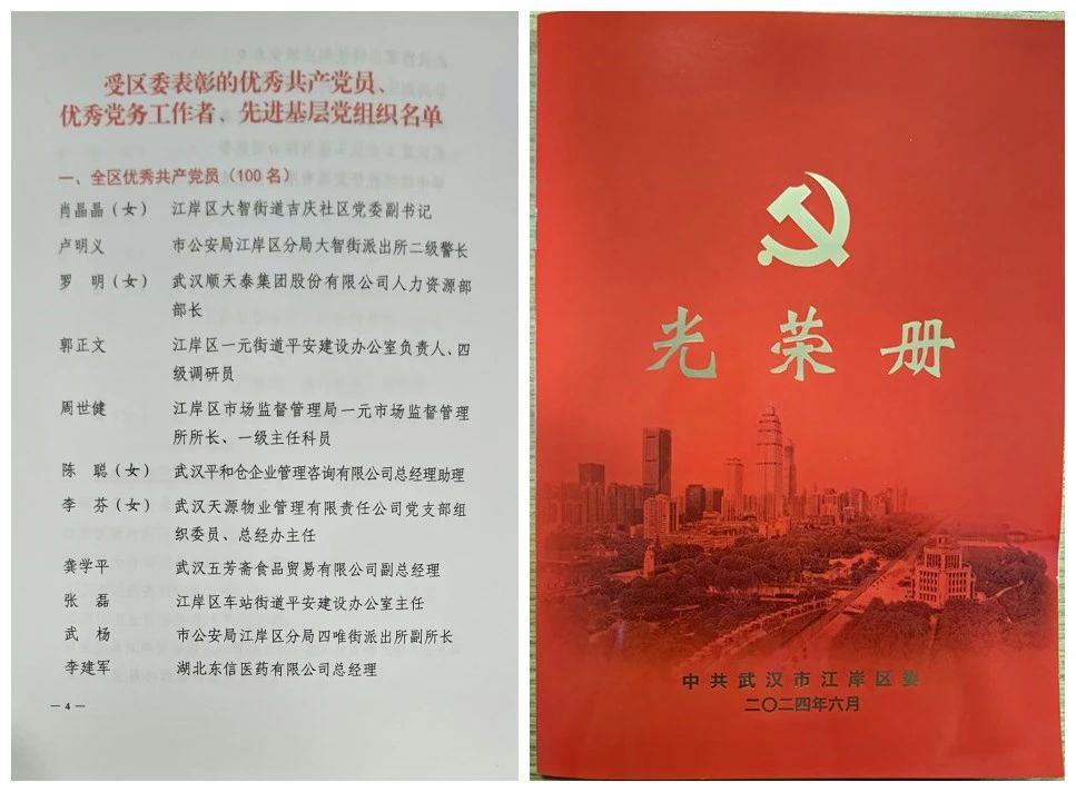 6月28日,武漢市江岸區(qū)召開2024年“兩優(yōu)一先”表彰大會,湖北東信醫(yī)藥有限公司總經(jīng)理李建軍同志被中共武漢市江岸區(qū)委評為“全區(qū)優(yōu)秀共產(chǎn)黨員”。這一榮譽不僅是對李建軍同志個人品德和卓越貢獻的肯定,也是對東信醫(yī)藥黨支部黨建工作的高度認可。